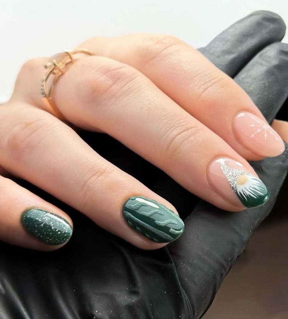 - Ask for a thin French band in velvet-sparkle green (Gel cat-eye or magnet gels work beautifully).