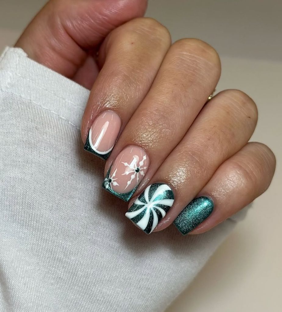Square tips feel fresh again, especially with an emerald micro-French, sparkling full-coverage accent, and a high-contrast peppermint swirl. The proportions are Short to medium, which makes this set wearable for everyday while still very “party at 7, brunch at 11.”