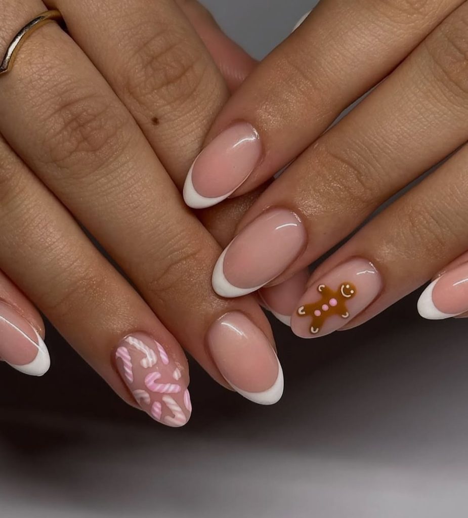A glossy soft-White French becomes instantly December-coded with a smiling gingerbread and pastel Pink candy cane. It’s sweet without skewing juvenile—a great pick for moms juggling class parties and office events who still want a dash of joy.