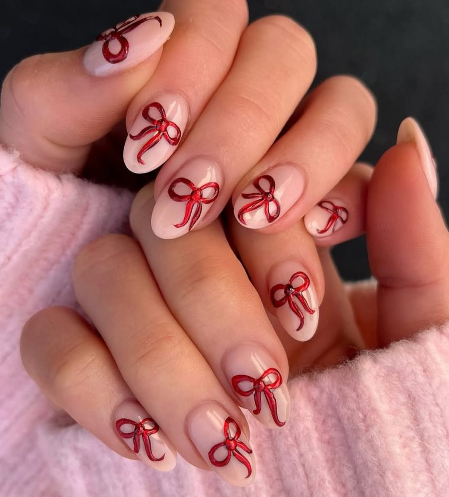 Glistening ribbon bows sit on sheer beige like tiny present toppers. The almond silhouette keeps the look feminine and Cute, while the sculpted bow lines in metallic Red feel modern for 2025 rather than cutesy. This is a great office-to-cocktail option if you want festive nails without full sparkle.