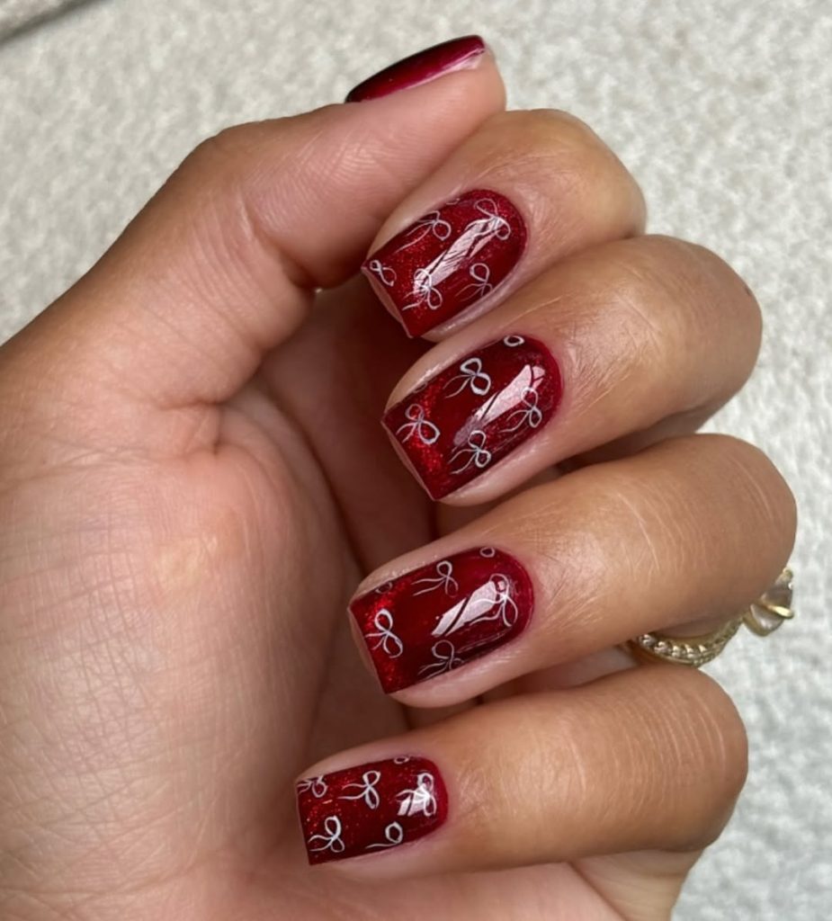 Short, square nails drenched in candy-apple Red with tiny White bows scattered across each nail. The effect reads like a luxe wallpaper pattern—festive, graphic, and delightfully Short. There’s a subtle jelly depth to the color that catches light without heavy glitter.