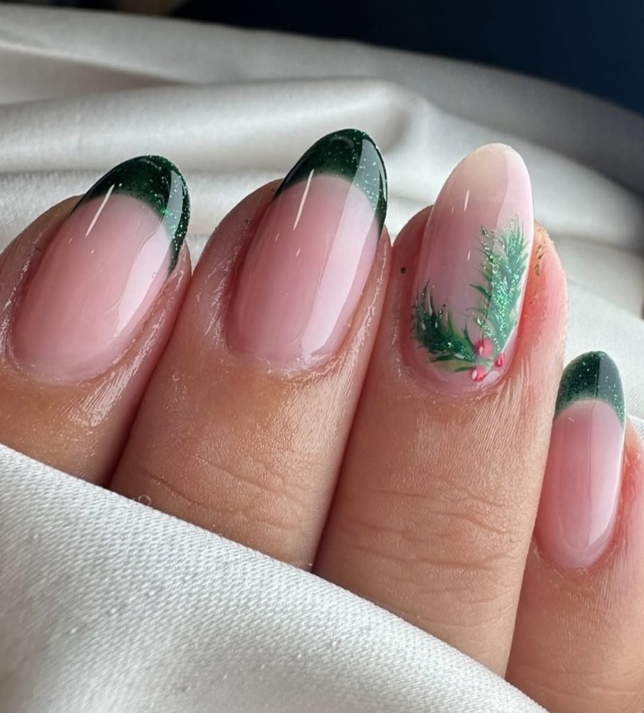 A deep Green micro-French frames each nail, while one accent nail carries a hand-painted sprig of holly dusted with shimmer. It’s elevated and Simple—the negative space delivers polish; the greenery whispers Holiday.