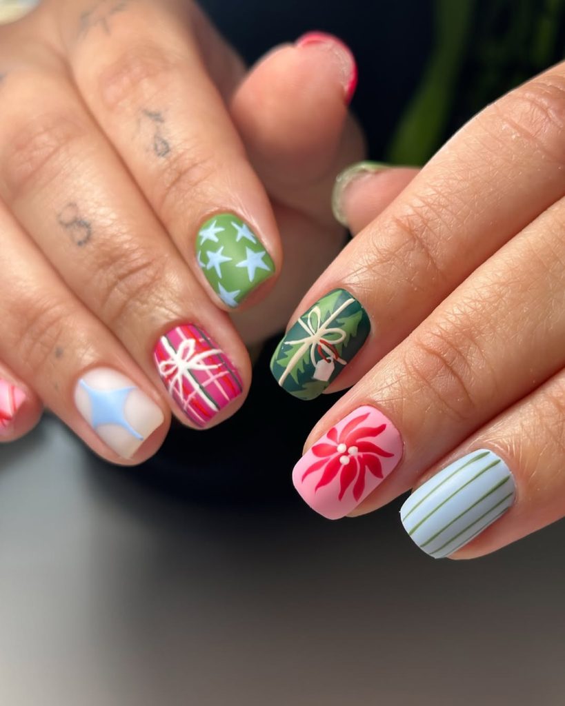 A cheerful, matte collage that plays with pattern: mint stars, tartan ribbon, holly on hunter Green, a pink poinsettia, and pin-stripe Blue. The boxy Short square is intentionally graphic and very 90s—trendy without shouting. It’s the manicure equivalent of a cool holiday sweater.