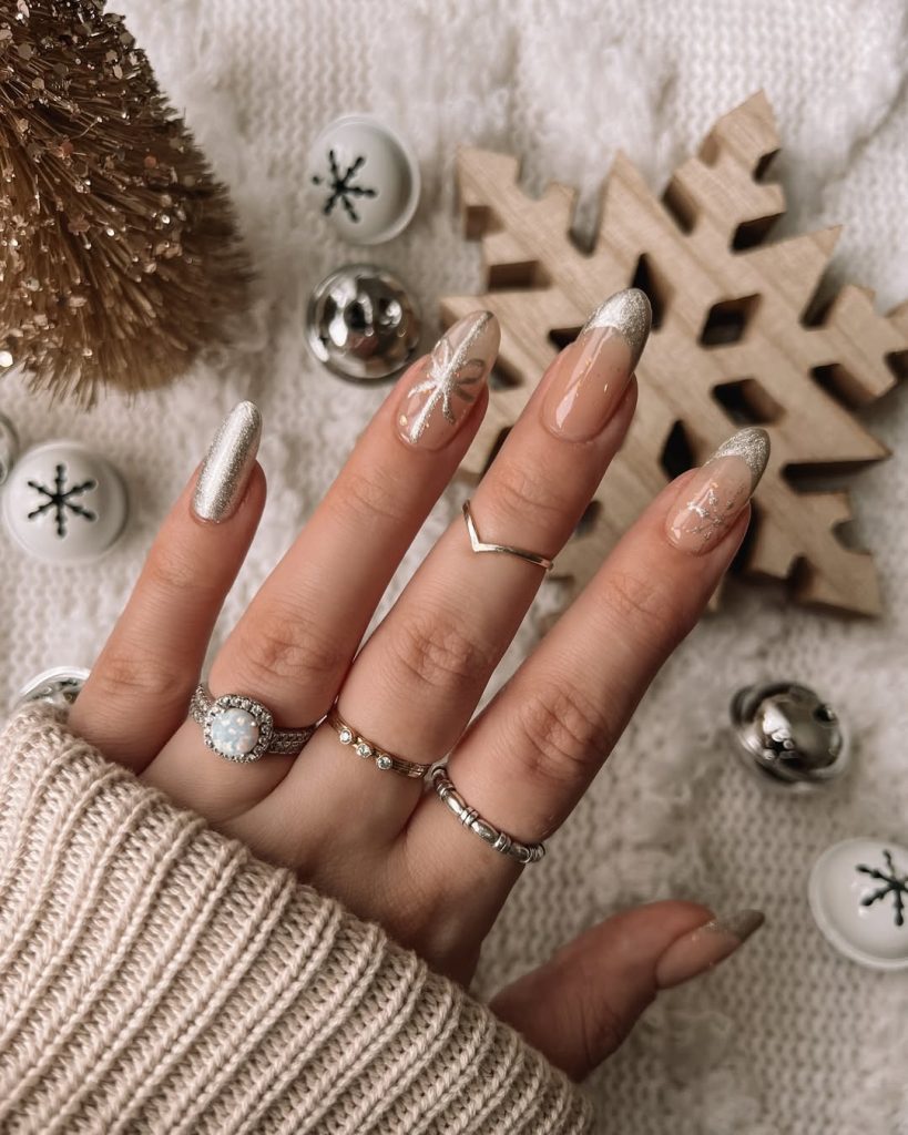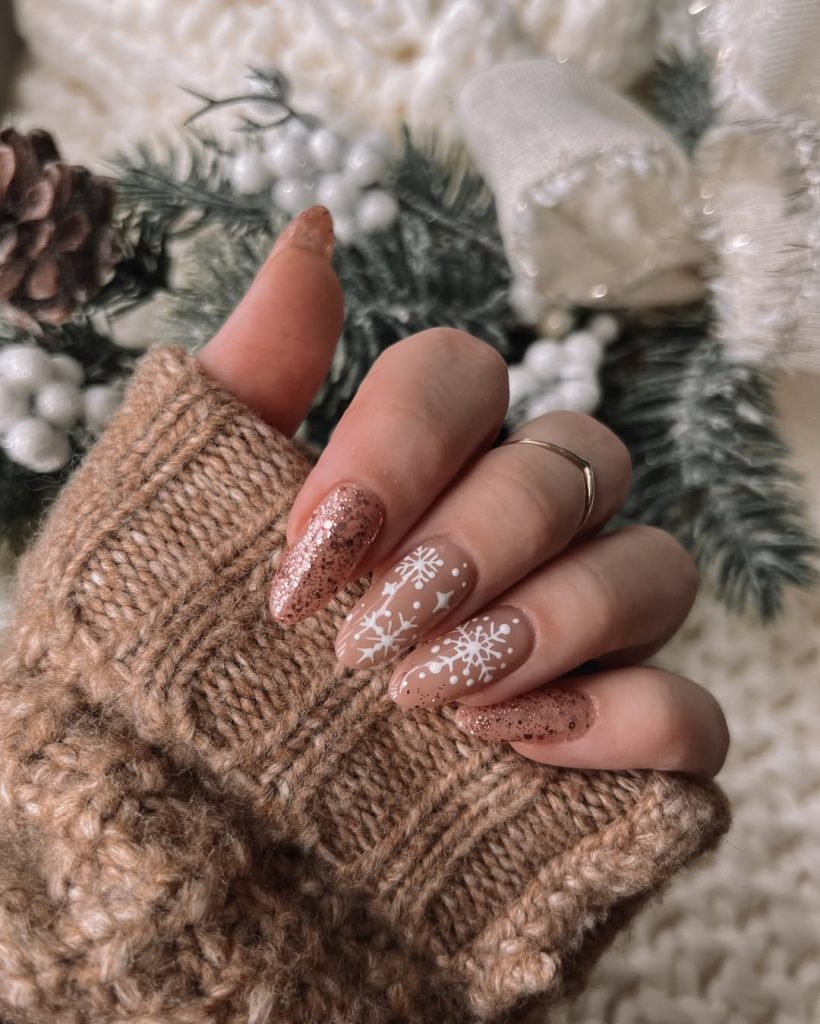 A sheer beige base, almond length, rosy-champagne glitter accents, and crisp White snowflakes—this is “quiet festive.” The tonal sparkle leans Gold without going brassy, which looks luxe under warm lighting and cozy knits.