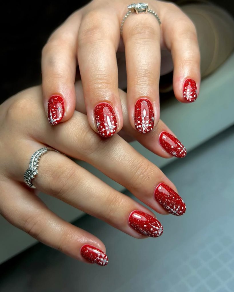 Classic party Red gets a magical snowfall treatment: a fine glitter base with hand-placed White starbursts that cluster toward the free edge. The oval, salon-friendly length reads Short to medium—perfect for typing all week and clinking glasses on the weekend. For 2025, this kind of tapered, concentrated sparkle feels chic and intentional.