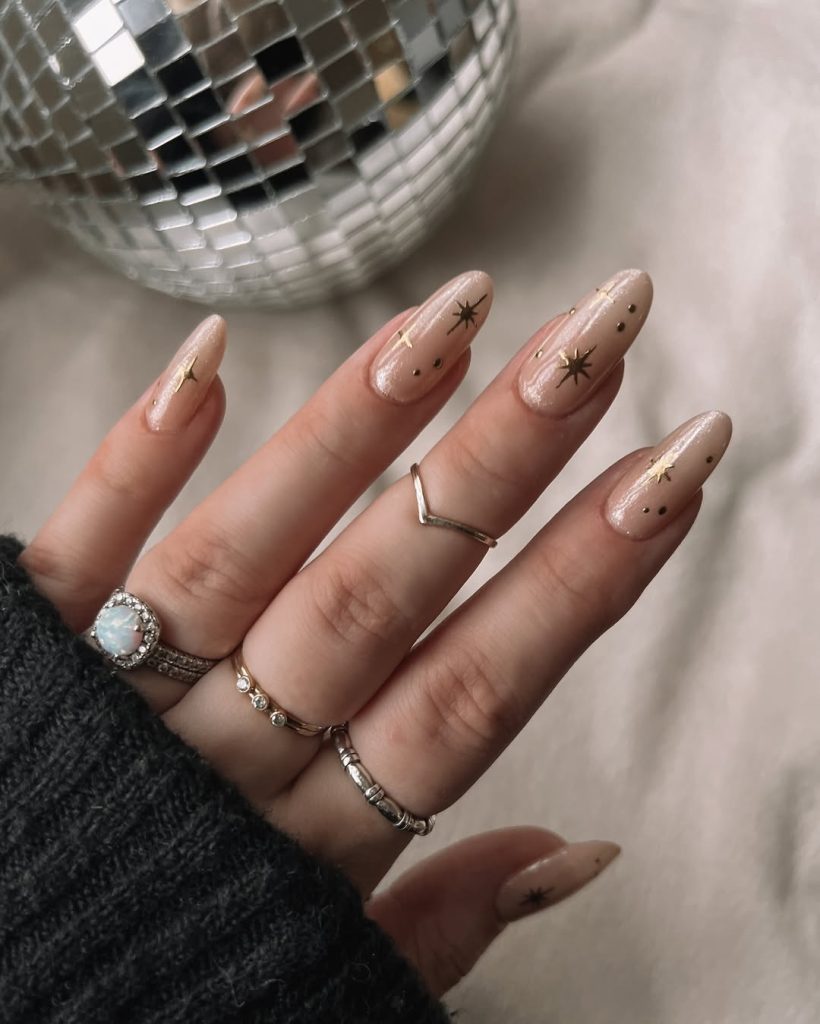 A translucent, twinkly nude scattered with tiny foiled starbursts and dot constellations. It’s disco-ball energy done minimalist—festive enough for a Holiday party, subtle enough for the office.