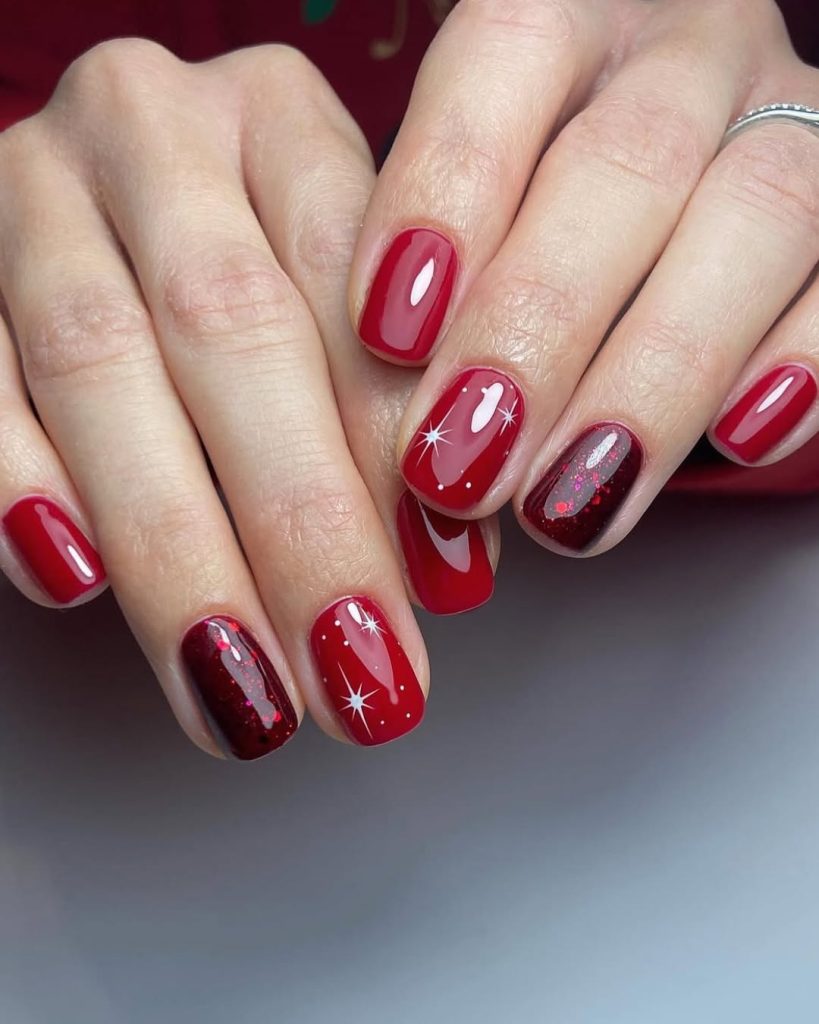 A mix of glossy crimson and deeper ruby glitter accents, punctuated by crisp White starbursts. The tidy, short-square length is practical yet polished—holiday nails you can live in.