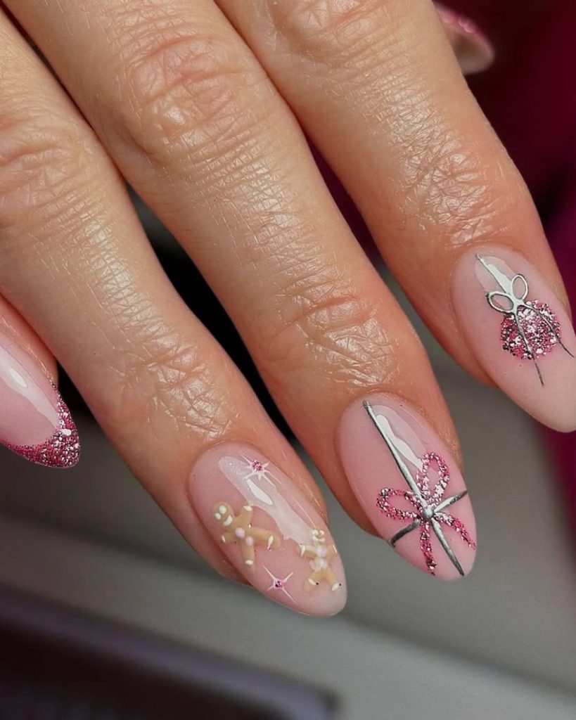 Sugar-spun Pink meets sparkly gift-wrap bows, a slim glitter French, and a tiny gingerbread duo. It’s unabashedly Cute and joyful—like the best parts of December on your fingertips.