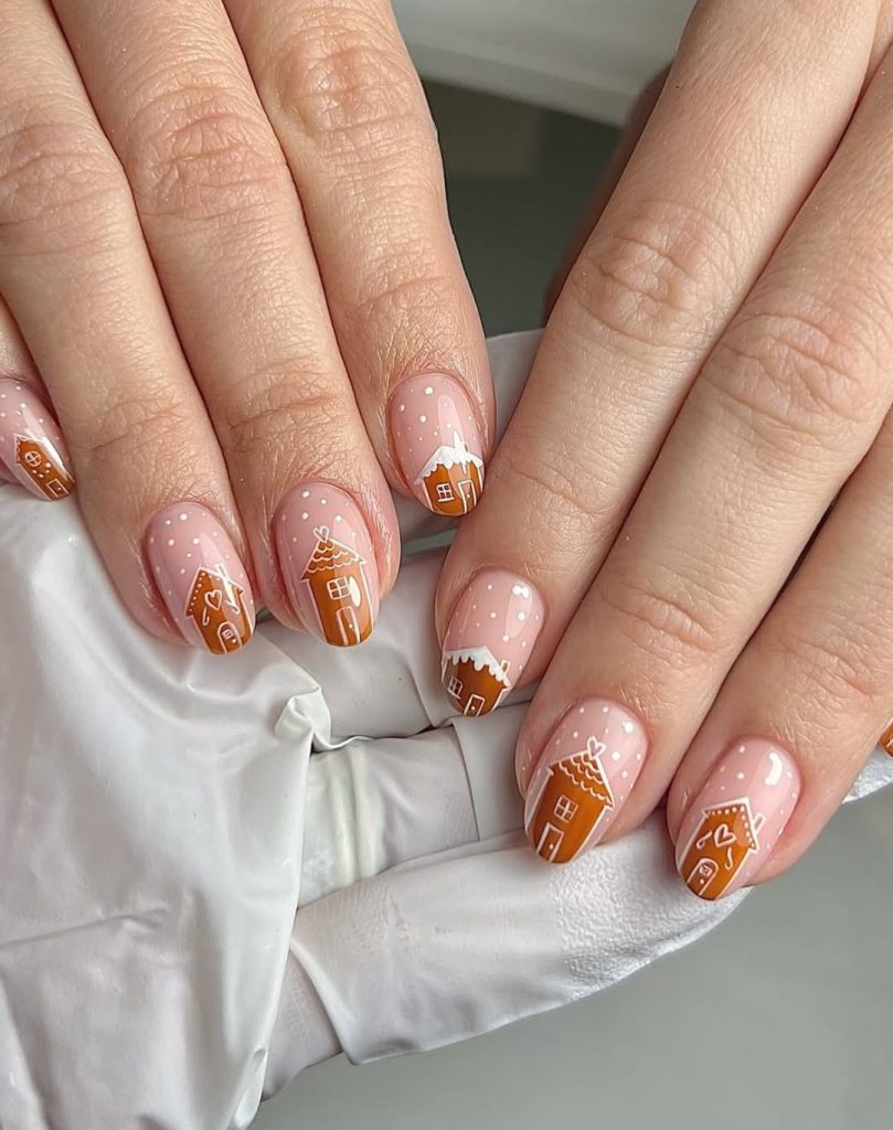 - Ask for a neutral builder Gel base for strength, then have your tech sketch houses in gingerbread brown and outline in crisp white.