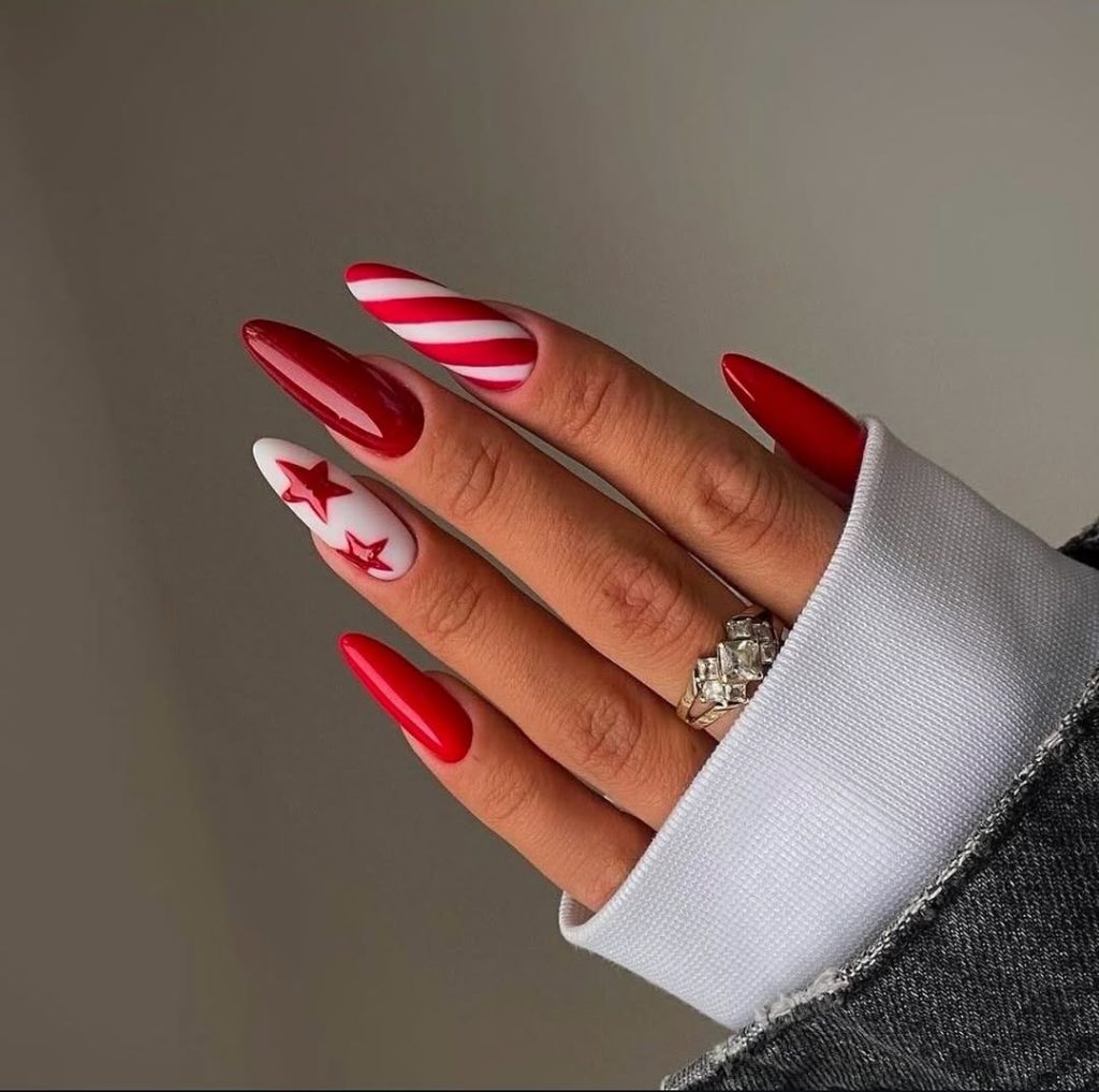 High-gloss crimson with a peppermint-stripe accent and star decals gives the classic Red manicure a graphic kick. The elongated almond silhouette leans long, perfect for party season, and the clean negative space keeps the White accents chic—not kitsch.