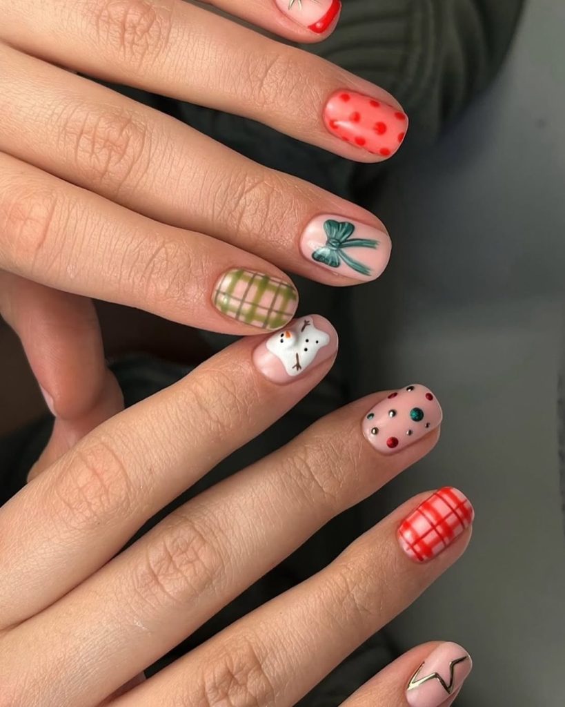 - Treat this like jewelry: two “hero” nails (plaid + snowman), the rest supporting motifs.