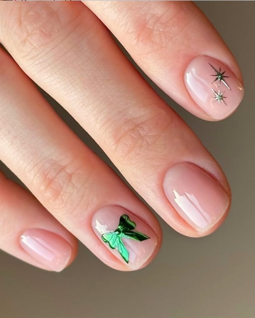 Barely-there nude with a foil-shine emerald bow and two tiny metallic starbursts. It’s refined, Simple, and delightfully Easy to wear—think minimalist manicure with a present-topper twist.
