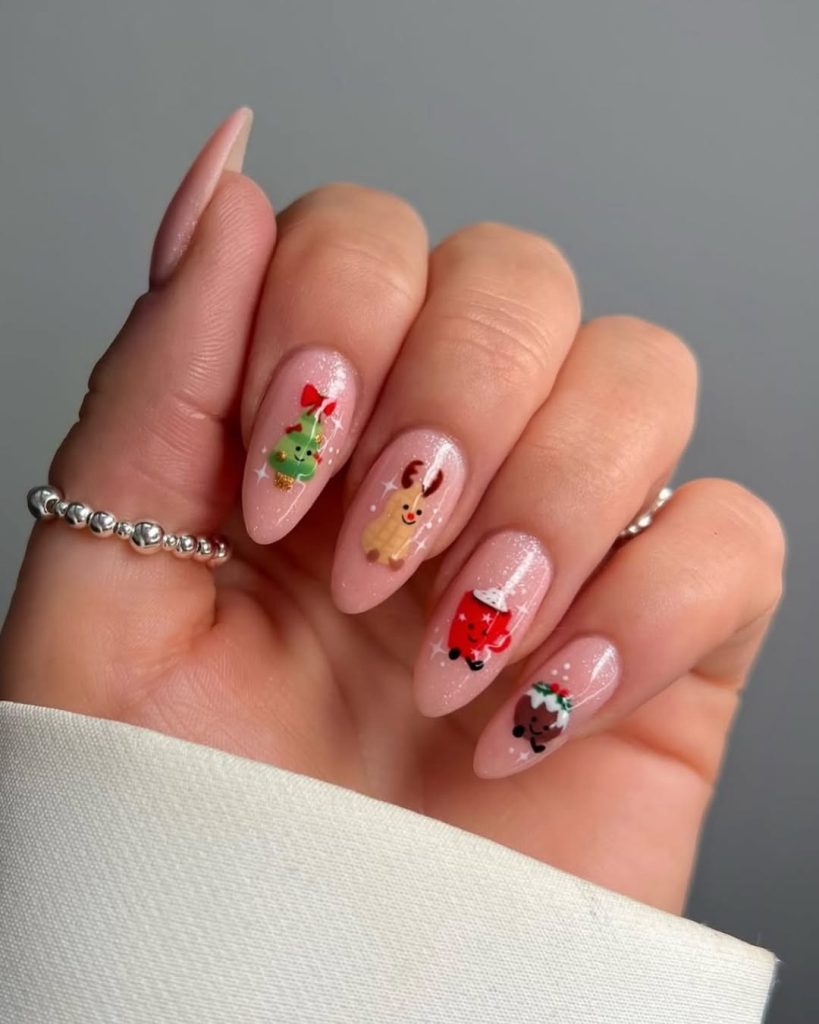 A dusting of fairy glitter over milky Pink sets the stage for the sweetest cast: a tree with a bow, a reindeer, a pudding, and a tiny Santa mug. This one is unabashedly Cute—instant mood-booster nails for cookie swaps and family nights.
