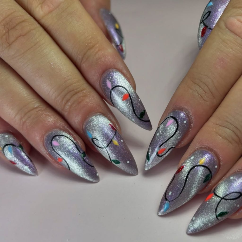 A moonlit, metallic base—somewhere between Blue ice and soft Purple—becomes a canvas for twinkling string lights. The inky Black wire meanders across long stiletto tips while mini bulbs pop in Red and green (plus pastel accents). Think disco-meets-driveway lights, and yes, it photographs like a dream.