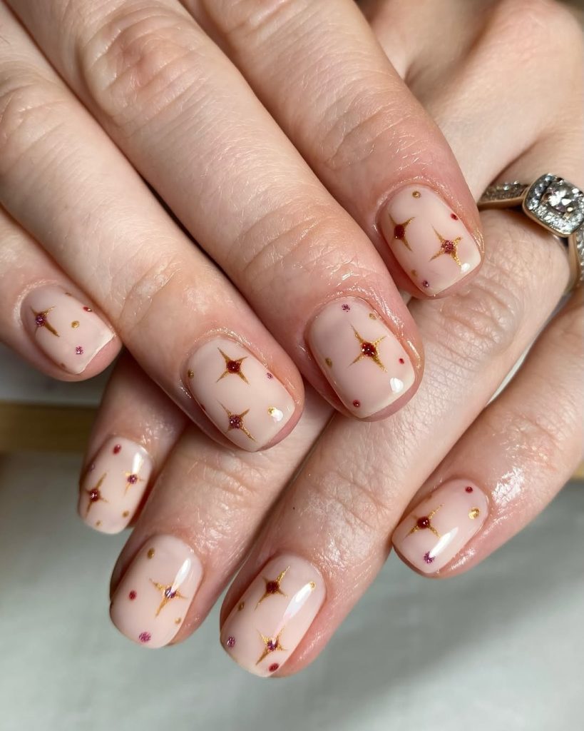 Translucent nude dotted with tiny constellations—starbursts rimmed in Gold, centers glowing Red and Pink. Think disco shimmer, dialed way down. It’s party-friendly but office-appropriate, with just enough glitter twinkle to catch candlelight.