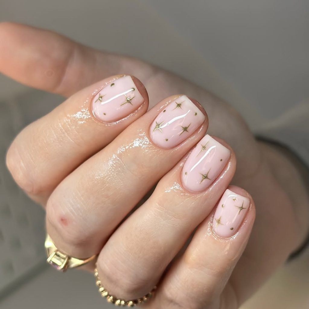 A milky pink base scattered with tiny Gold starbursts and dots—understated, Simple, and endlessly wearable. This is the minimal girl’s holiday set: clean, luminous, and totally 2025.