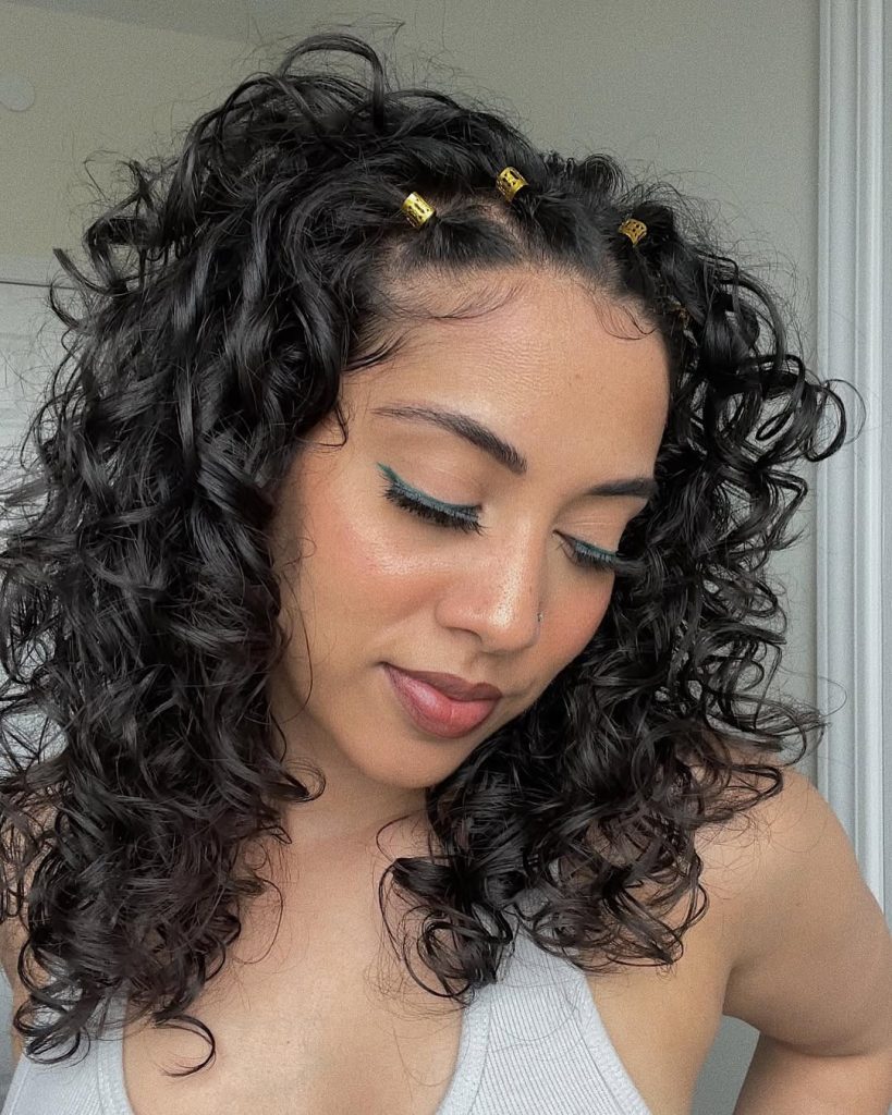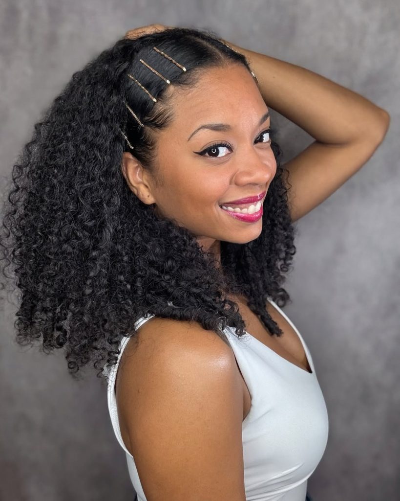 Parallel gold bars along the part provide structure while the curls stay airy and natural. It’s sharp, minimal, and surprisingly formal with a blazer, yet playful with denim. Think of it as the “liquid liner” of curly styling—precise up top, free below.