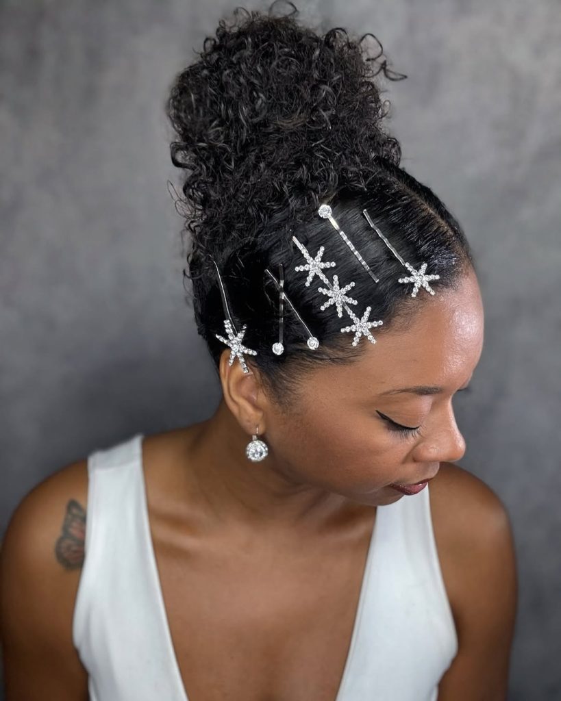 A soft, rounded bun sits high and full, with a face-framing tendril for romance. The golden leaf clip turns it into an elegant updo that suits cocktail hours, gallery openings, or formal events for Black women who want glamour without stiff lacquer. The key here is low tension: gather curls loosely with a scrunchie, then pin the bun so the volume does the heavy lifting rather than a tight pull.