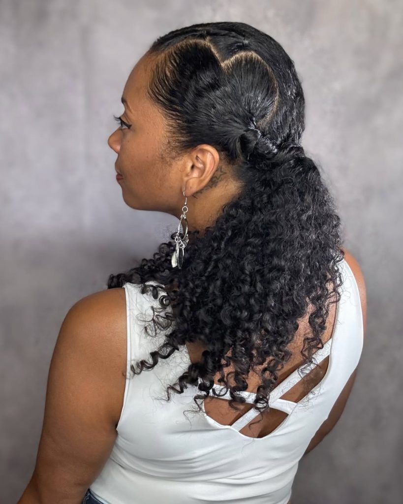 A sculpted part flows into symmetrical twists and a mid-ponytail that keeps curls defined and off the face—clean, easy, and fabulous for school pickups, gym-to-desk days, or travel. The shape is flattering on medium-length to long curls and reads instantly put-together.