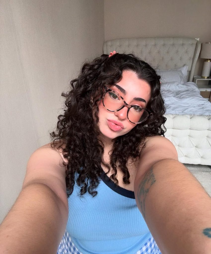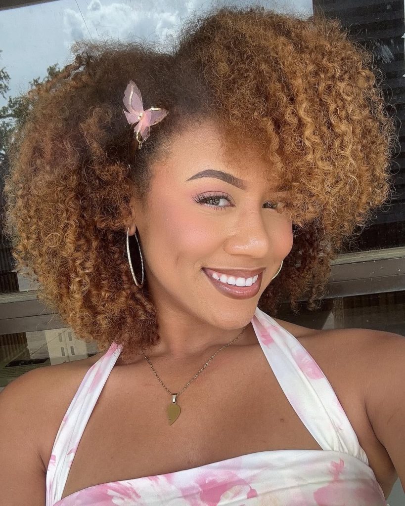 Honeyed coils are angled to one side with a translucent butterfly clip—flirty and sunshine-ready. It’s the kind of look that makes sense for farmers’ markets, patio dinners, or summer vacations when you want your curls off your face but not pinned back entirely.