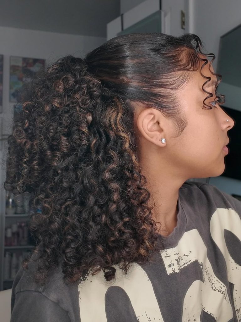 A sleek crown lifts into a petite half pony while two glossy spirals trace the cheeks—soft, flirty, and commuter-proof. I reach for this when I want polish but still need my curls to be breathable in summer heat. Use a pea-sized gel to smooth the hairline, then a light curl cream through the lengths so the ends stay natural and touchable. It’s an easy, quick tweak on everyday styling that flatters medium hair and longer lengths, and it reads instantly elegant with minimal effort.
