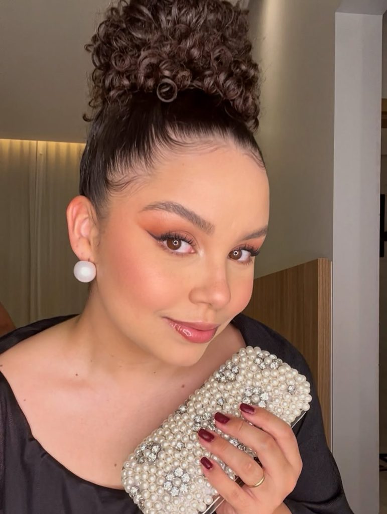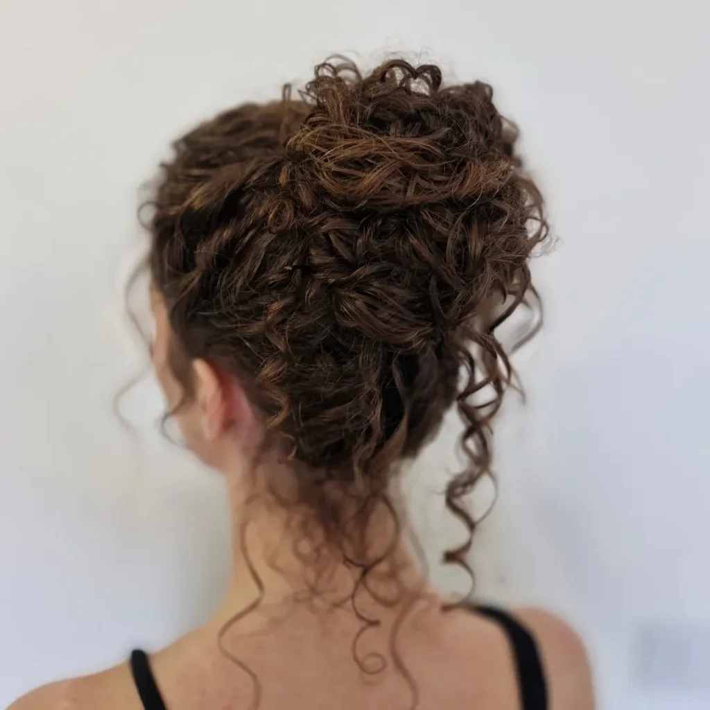 A plush, rounded topknot anchored to a glassy base—chic, secure, and party-ready. Keep tension moderate: brush up with a conditioning gel, fasten with a satin scrunchie, then pin curls so they bloom rather than compress. This is my go-to updo for dinners, birthdays, or any formal invite when you want height without headaches. A soft-edge brush at the hairline and a glossy balm on the bun add that red-carpet gleam.