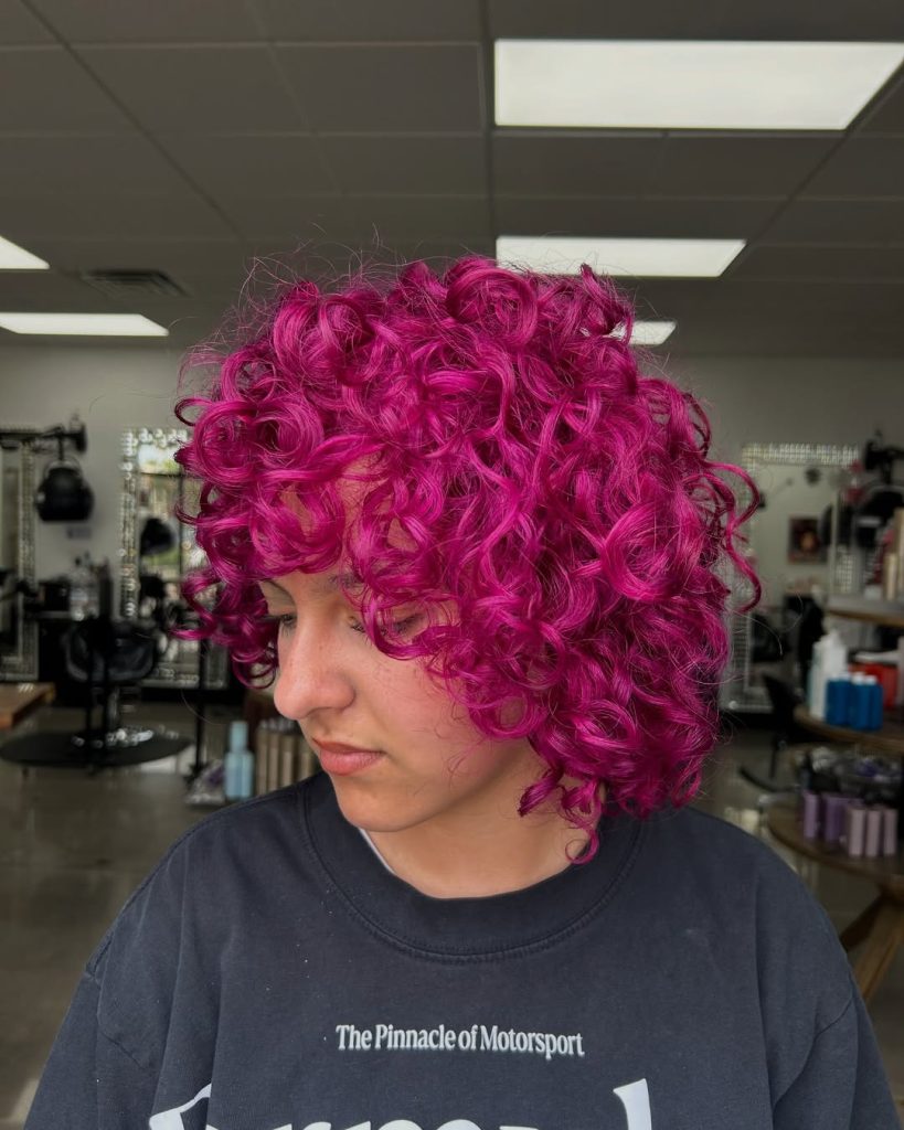 A saturated magenta on a rounded bob with wispy curled bangs—bold, joyous, and very Baddie. The silhouette is airy, so the color can be loud without feeling heavy. Pair with a crisp tee and glossy lip, and you’re done.