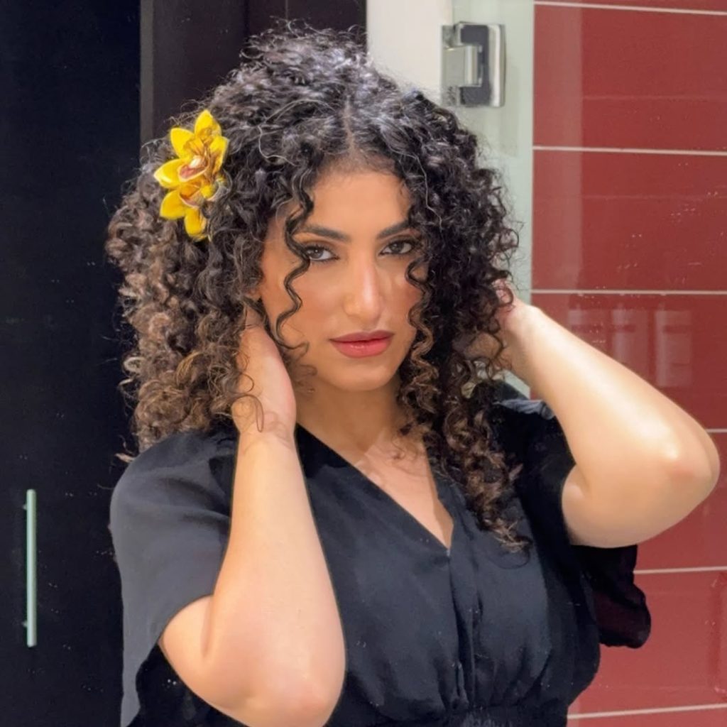 Glossy black curls sit at a medium length, side-swept for lift at the crown and a naturally sculpted cheekbone.