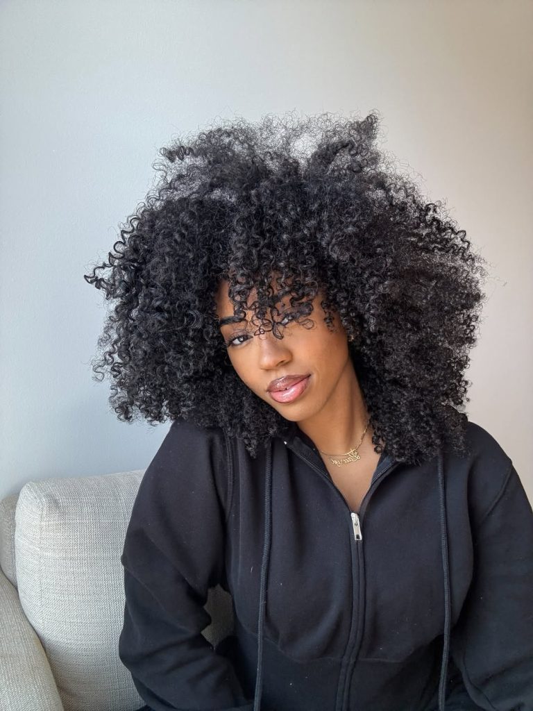 A rounded silhouette of buoyant ringlets and soft, airy fringe—effortless, editorial, and unapologetically natural. Ask your stylist for interior shaping to remove bulk while keeping the halo effect; it’s that modern “cloud curl” vibe trending through 2026. For home styling, layer leave-in under a lightweight gel, diffuse on low, then pick only at the roots for lift. The result is a simple, confidence-first look that swings from coffee runs to formal nights with a red lip and a square-neck dress.