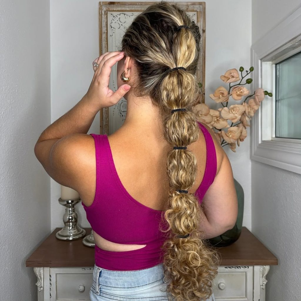 Elastic markers spaced down a long pony turn coils into soft bubbles—graphic from the back, romantic from the side. Start with a mid-pony, add elastics every few inches, then gently tug each section for volume so the bubbles read plush, not tight. It’s vacation gold: swim, rinse, refresh, go. Pair with hoops and a tank for effortless summer energy.