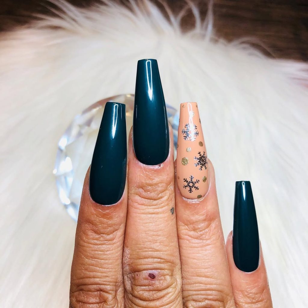 High-gloss forest nails meet a nude statement finger dotted with metallic confetti and delicate Snowflake Art . The elongated coffin shape screams celebration, and the contrast between lush green and neutral makes the snow crystals pop. If you wear Acrylic , this length will feel sturdy; Gel overlays work too.