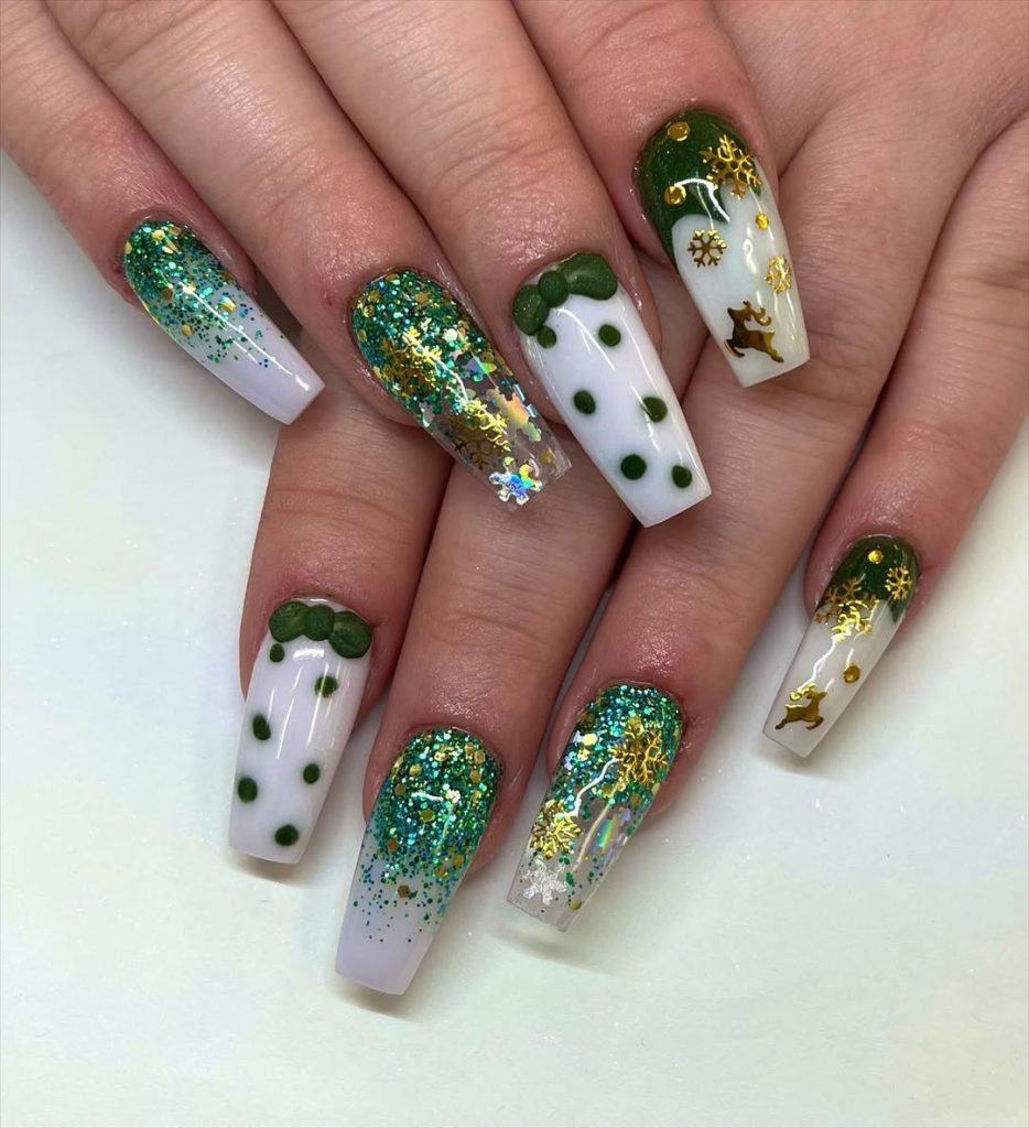 A milky base melts into a swooped evergreen French tip , scattered with foiled decals and tiny sculpted dots for texture. You’ll spot reindeer and snow motifs with gold accents—subtle, but unmistakably seasonal. The long, crisp silhouette sits between Square and soft coffin—perfect for Acrylic extensions.