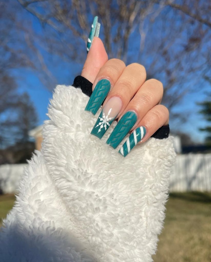 Holiday sweater nails, elevated. Deep teal-green panels feature raised cable detailing (a soft-touch Matte effect) next to a clear-to-neutral nail hand-painted with a crisp White and evergreen Snowflake , plus a candy-stripe sidekick. The long coffin shape makes the knit pattern read couture rather than crafty.
