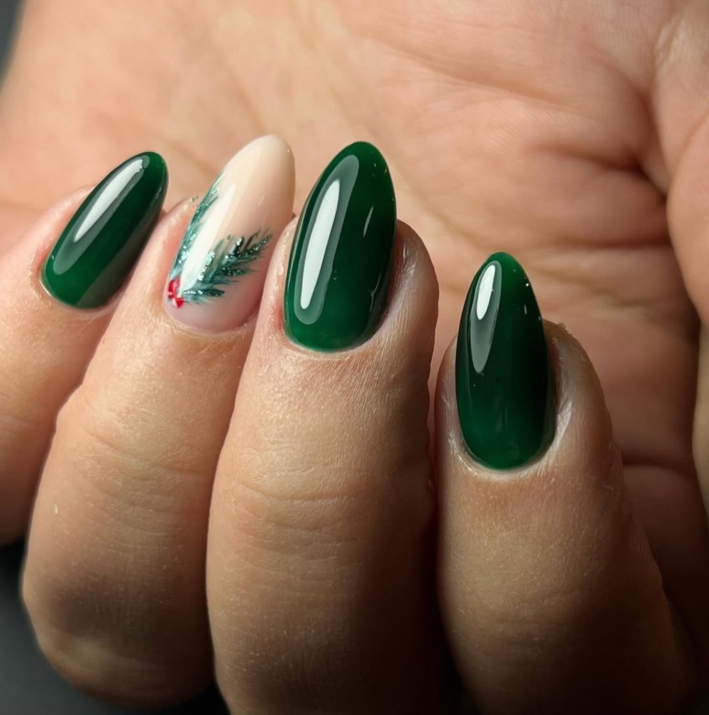 A rich, glossy pine green wraps every finger except one: a sheer nude canvas painted with a delicate bough and a single berry— Red and green done the quiet-luxury way. The medium Almond shape elongates hands without sacrificing typing comfort. This sings as Gel or Acrylic almond depending on your preference.