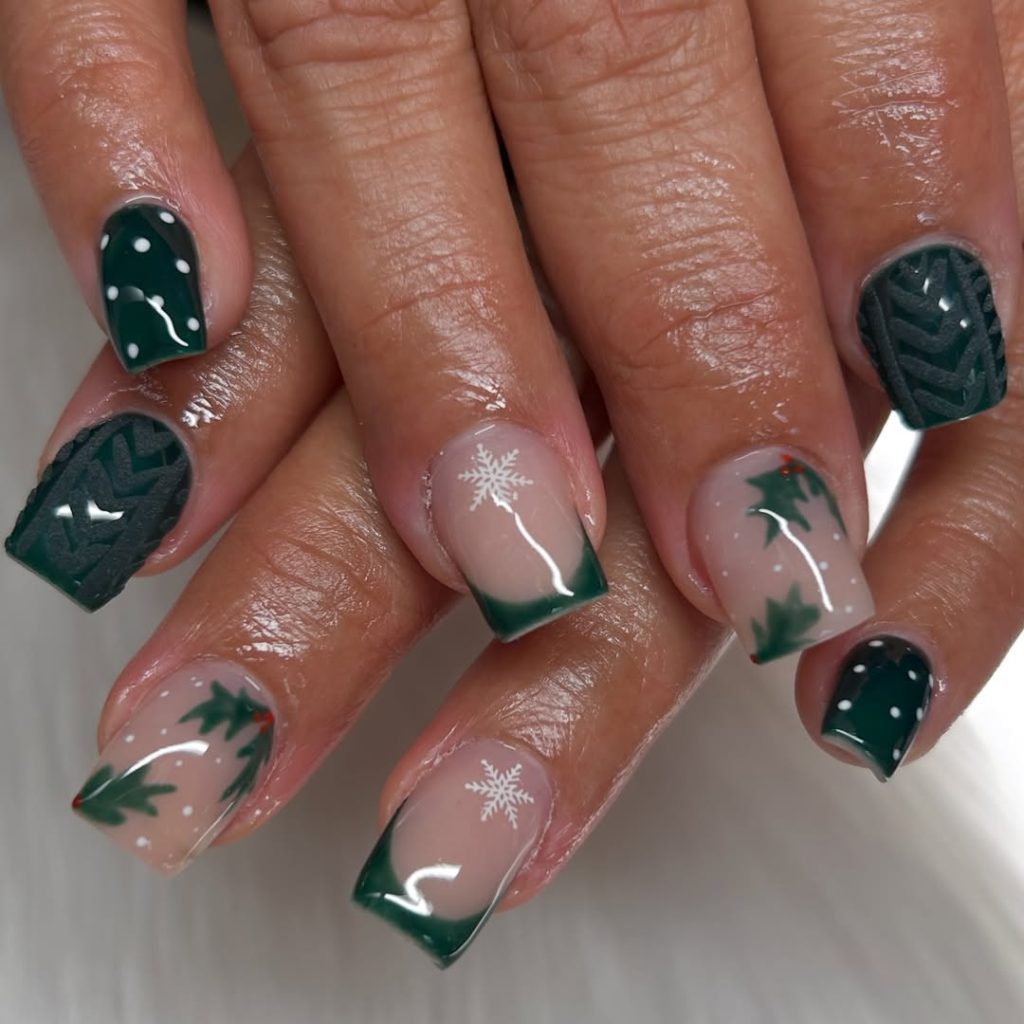 A winter capsule in manicure form: forest French tip edges on sheer nails, hand-painted Snowflake accents in White and evergreen, polka-dot snow, and two cozy sweater-texture nails with subtle Matte relief. The shape is Short square , which keeps the mixed motifs chic and practical.