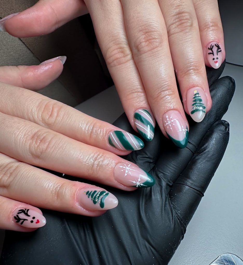 A festive medley on soft Almond : diagonal candy stripes, evergreen tips, twinkly Snowflake line work, and a cute reindeer face with a tiny Red and nose. Two sculpted tree nails add dimension—one piped in green gel, one dotted with sparkle.