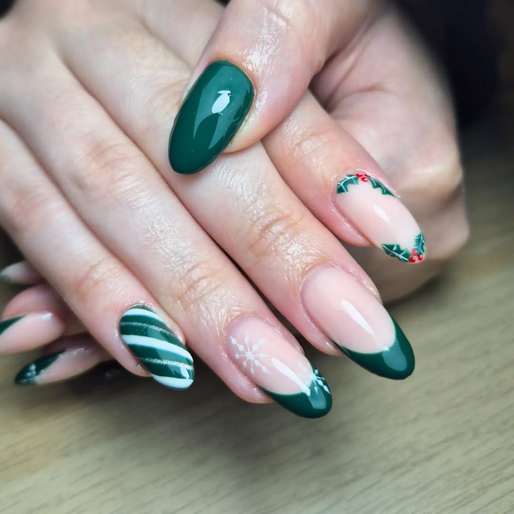 A glossy, solid evergreen nail anchors the set while the rest flaunt thin French tip arcs and micro holly leaves with bright Red and berries along the smile line. Clean, feminine, and endlessly wearable.
