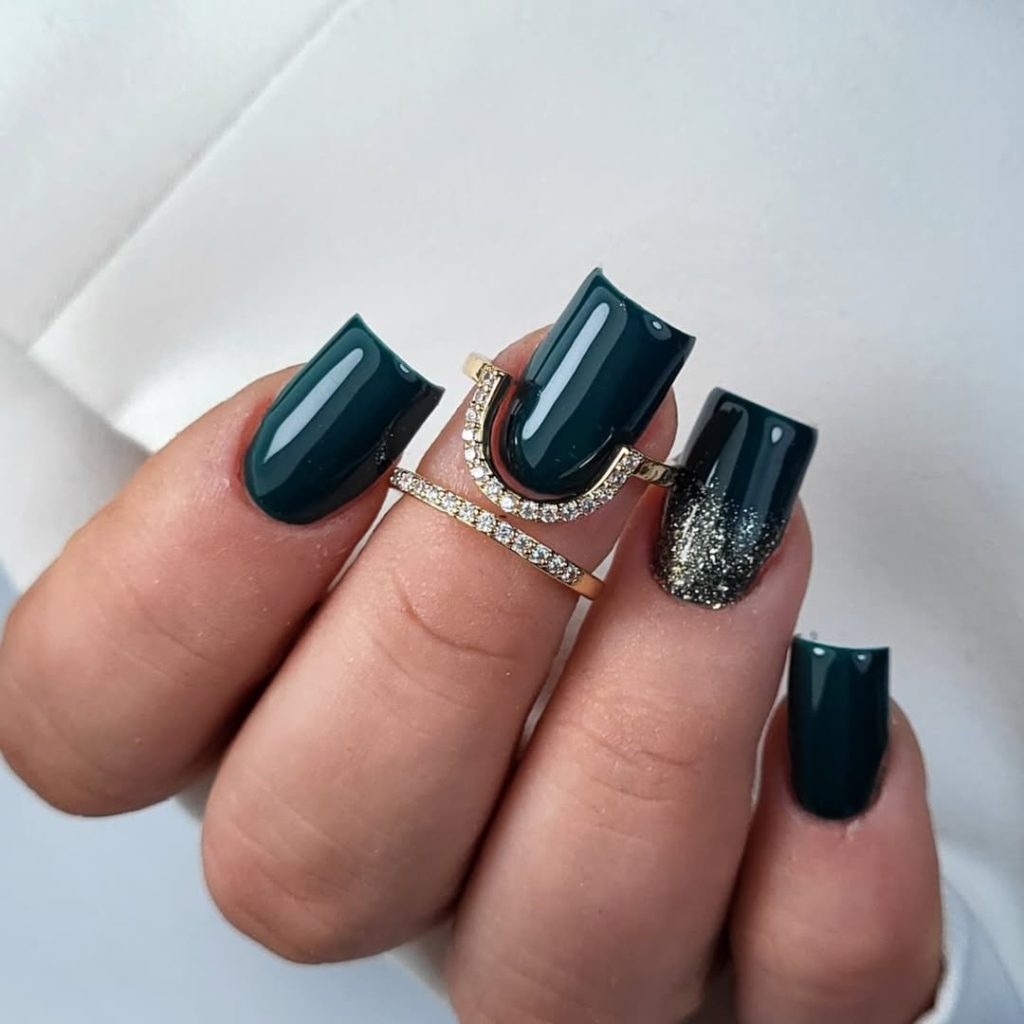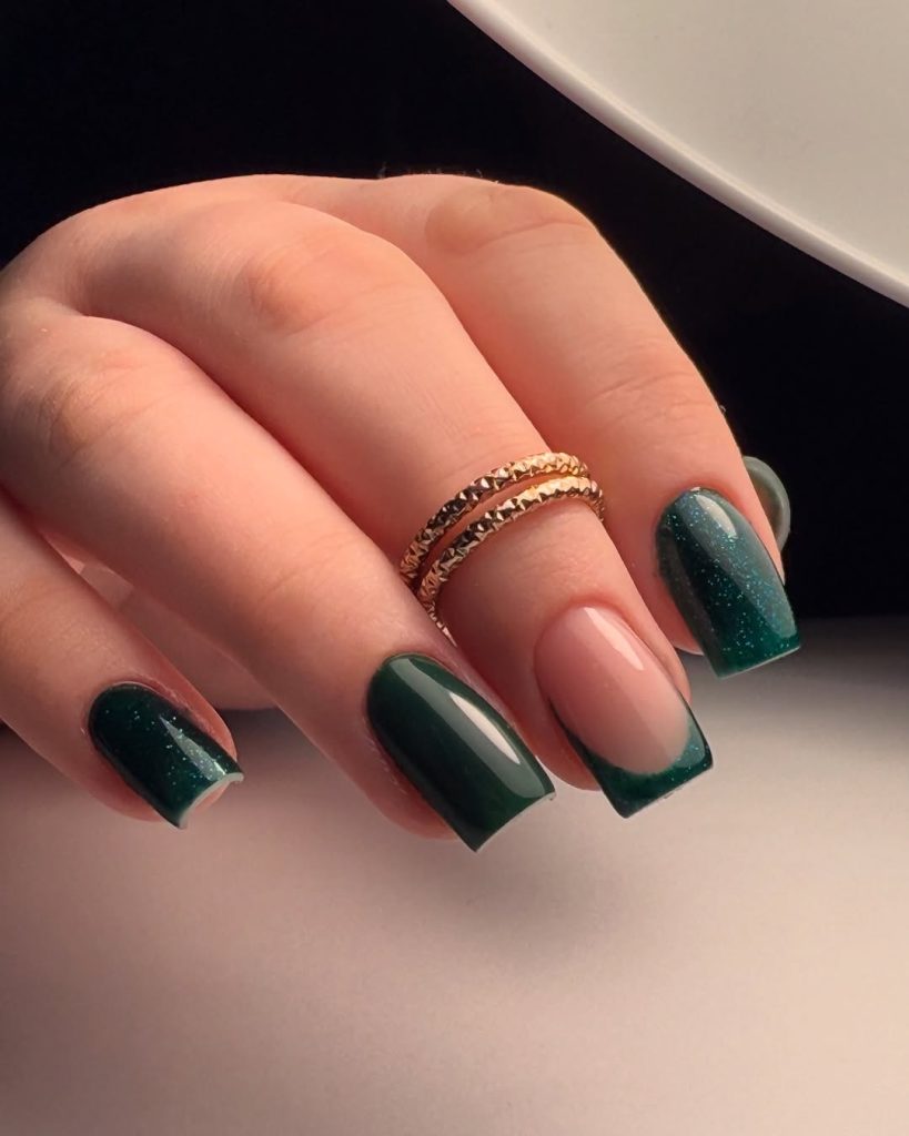 A chic Square set mixes glossy evergreen with a sheer “reverse French” half-moon and a deep emerald shimmer that reads like faint Glitter under low light. The balance feels upscale—think martini hour, not craft table.