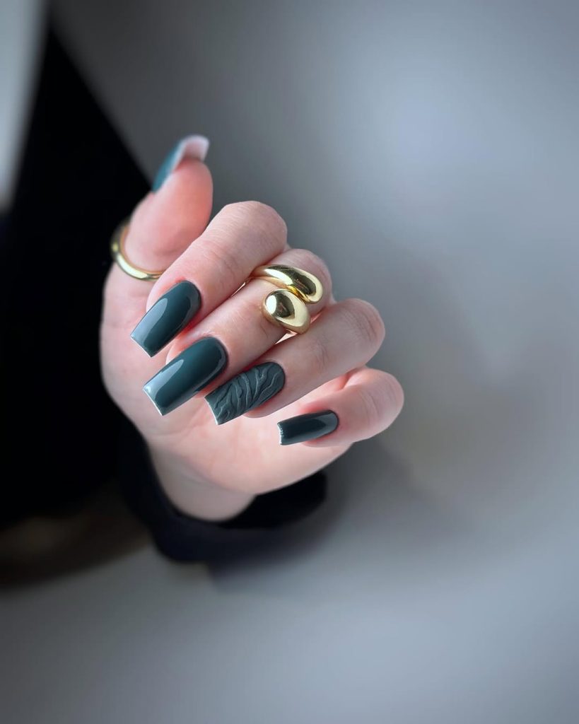 Sculpted medium Square nails in inky green get a single textured accent—wrinkled knit detailing in velvet-soft Matte over gloss. The contrast is quiet but couture, and the length is keyboard-friendly.