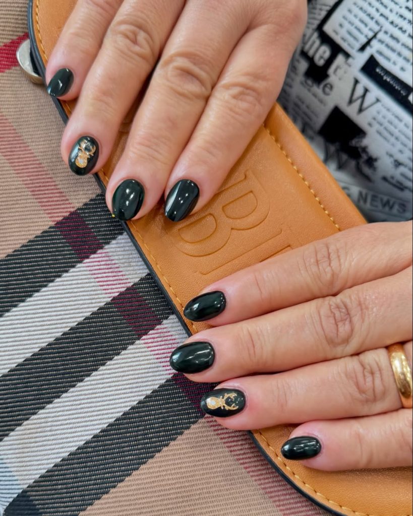 Sometimes the most impactful choice is restraint. A single deep-forest shade on medium Almond nails reads expensive and timeless—think “cashmere manicure.” This works beautifully as Gel or Acrylic almond if you want added strength.