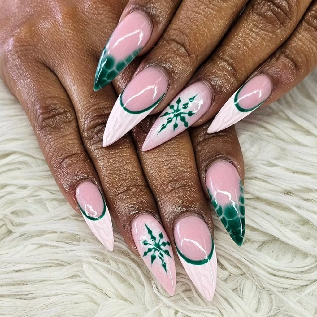 High-drama stiletto tips meet soft holiday details: deep-forest crocodile texture at the points, pale-pink panels with embossed knit swirls, and crisp evergreen Snowflake motifs. Several nails carry a whisper-thin evergreen French tip arc that feels couture rather than cutesy. If you love length, ask your tech for sculpted Gel or Acrylic —the structure keeps this silhouette strong through party season.