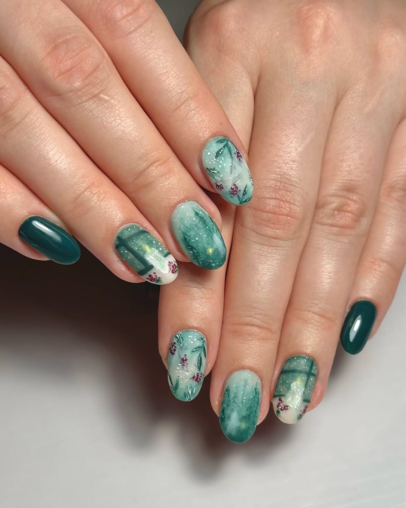 Why it works in 2025: Mixed finishes and mixed neutrals keep green feeling modern, not traditional. Ask your tech for a neutral “veil” base on one finger to showcase decals or hand-painted flakes with gold highlights.