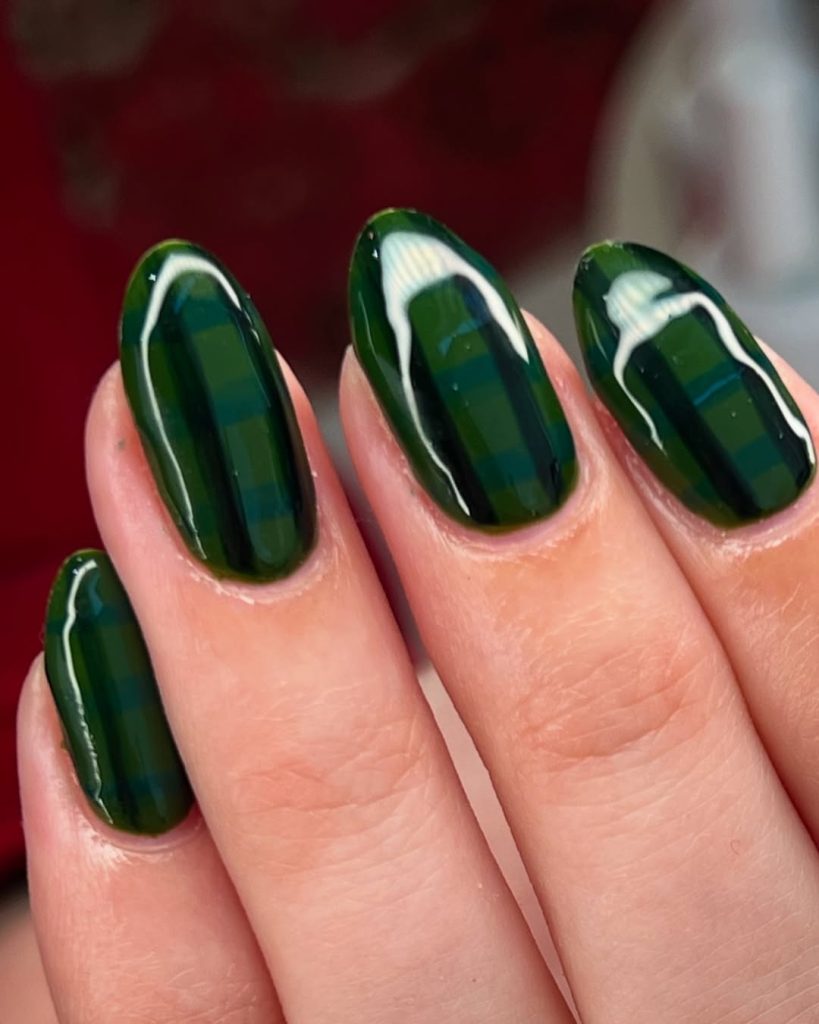Bold forest squares intersect with inky stripes for a lacquered Black Watch moment. The pattern reads classic winterwear but in a modern, glassy finish. Works beautifully on medium Almond nails—the curve helps the Plaid wrap naturally without distortion.