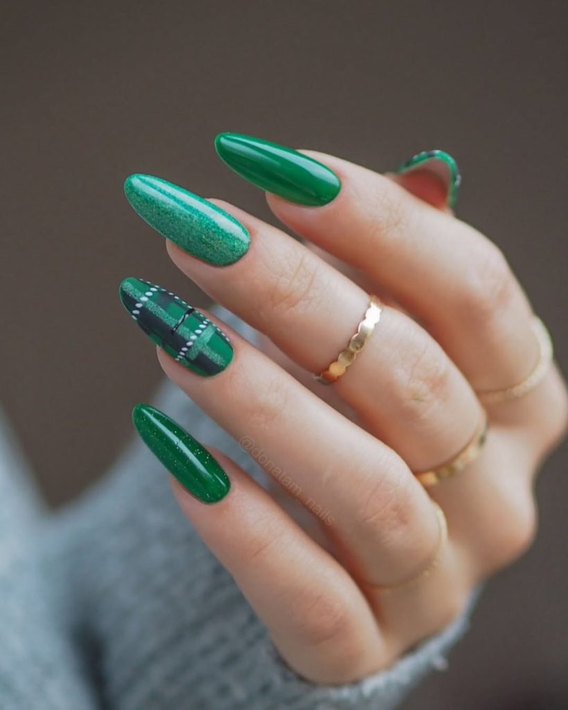A wearable green medley: one subtle sparkle nail, two glossy solids, and a single Plaid accent lined in silver for that gift-wrap vibe. The elongated Almond shape flatters every hand and keeps the look refined rather than playful.