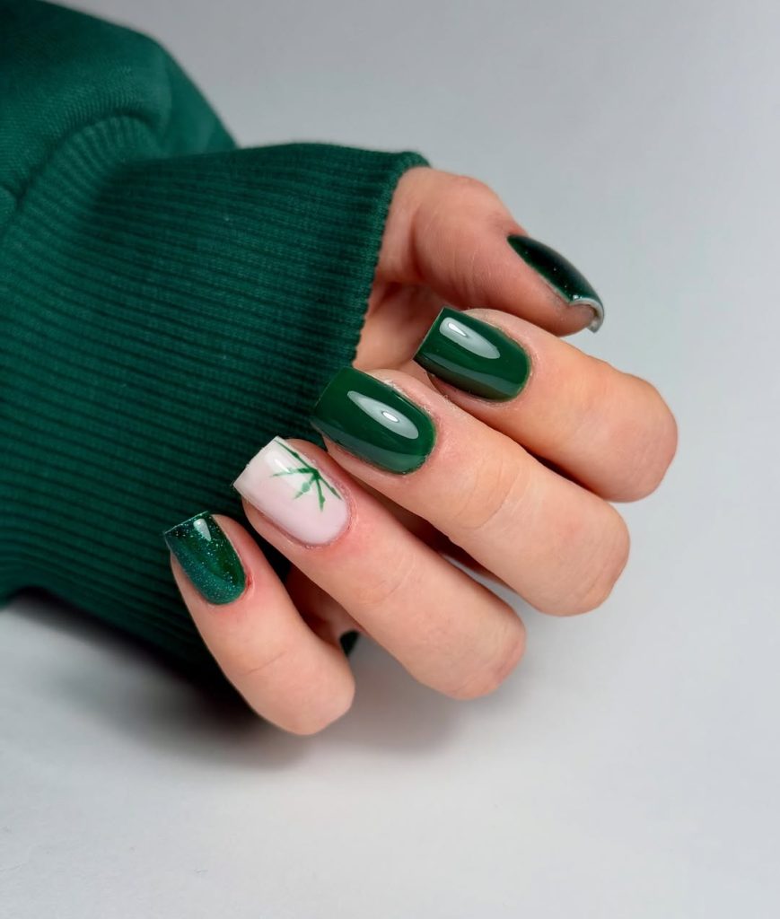 Clean and polished, this set mixes glossy forest nails with one soft-milky accent painted in a slender pine branch. The tidy Square silhouette is a perfect everyday length—practical and undeniably chic. Ask for a durable Gel overlay to keep that glassy finish through travel and gift-wrapping season.