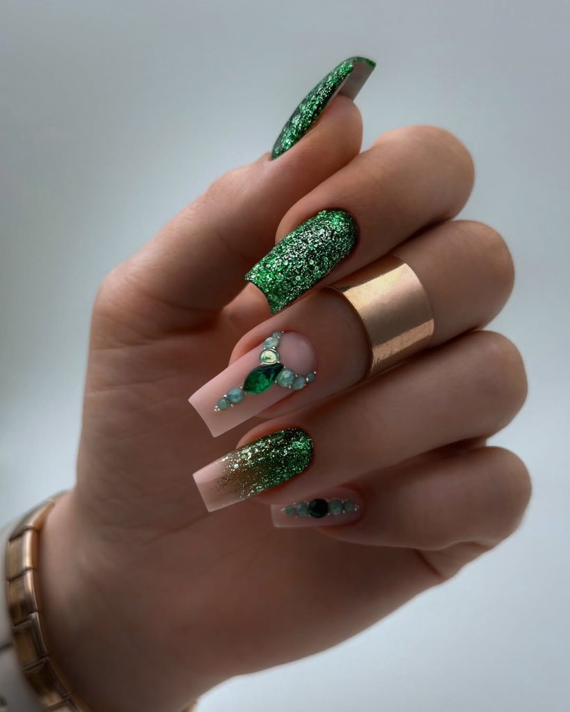Holiday maximalists, this is your moment: two nails drenched in emerald Glitter , a champagne-to-emerald ombré, and a centerpiece studded with multi-size stones that read like couture costume jewelry. The elongated Square (almost soft-coffin) shape balances the sparkle, and the negative-space cuticle keeps it elegant.
