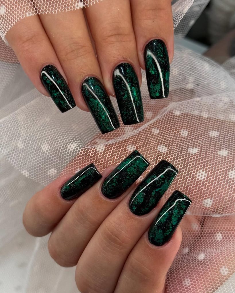 Deep green veining swirls over a blackened base for a sumptuous marble effect—glossy, moody, and made for candlelit rooms. The uniform long Square shape gives runway polish, while the high-shine topcoat adds dimension.