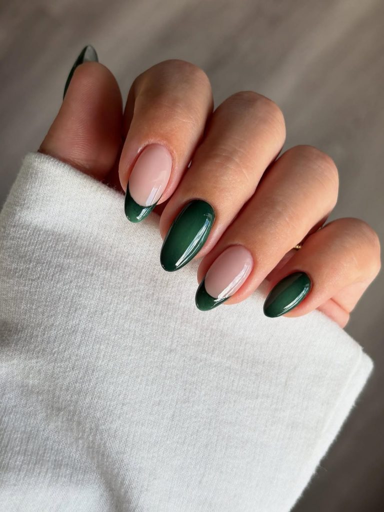 Soft blush bases meet glossy forest French tip arcs, alternated with solid evergreen nails. The proportions are refined—thin smiles that hug the curve of a medium Almond shape. This is the kind of Simple holiday manicure that looks expensive in every outfit and photographs beautifully.