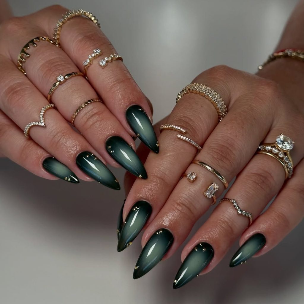 A moody green-to-charcoal gradient runs down elongated Almond nails, finished with pinpoint metallic studs with gold at the base and tips. The magnetic sheen (ask for cat-eye pigment) delivers that soft-focus Chrome glow without losing depth. It’s glam but restrained—perfect when your calendar is packed with back-to-back events.