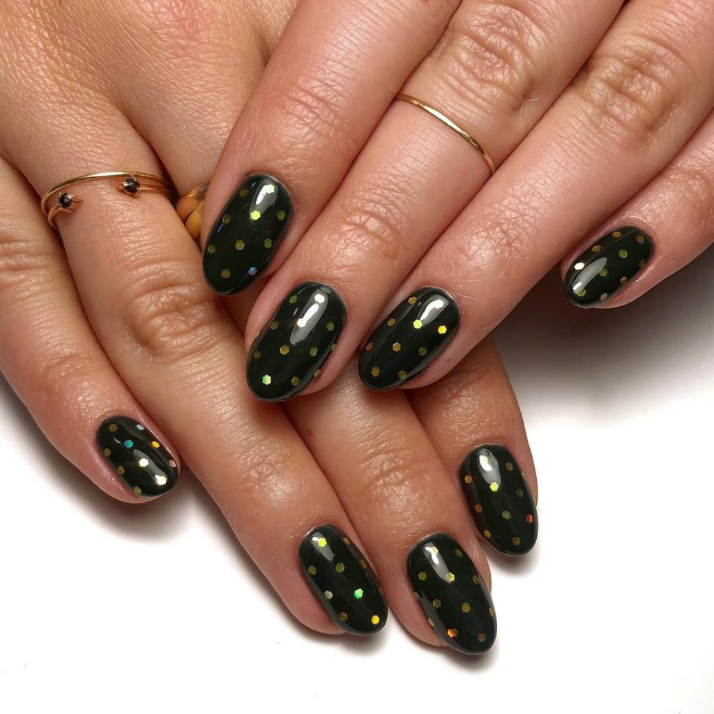 A deep evergreen base is topped with tiny holographic dots that flash Gold as you move. The shape is softly Almond , kept Short and wearable; the finish is glassy, which suggests a salon-perfect Gel topcoat. It’s the definition of Simple done right—clean, festive, office-safe.